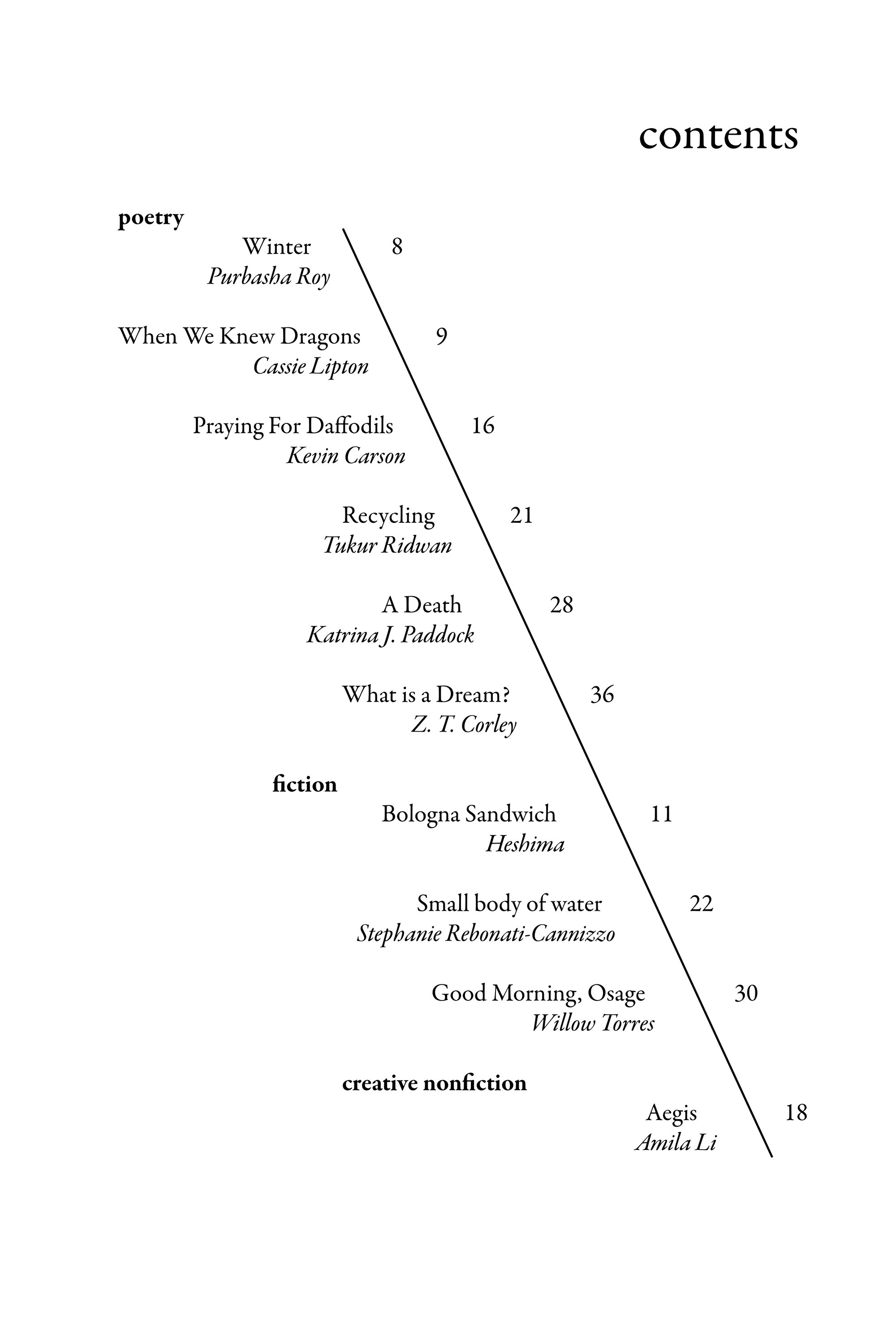 in our inaugural issue, we invite you to consider the refractive nature of existence – the way in which memory bends experience, how emotion bows interpretation, how circumstance might divert nature.